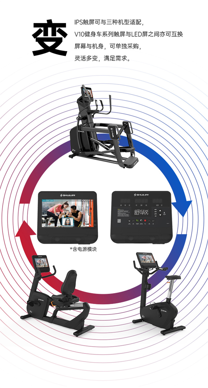 舒华立式商用爱游戏体育-爱游戏| 爱游戏官方网站 SH-B9100U(V10)触屏版拥有超大显示和操作屏幕, 可以任意设置阻力、时间和距离等参数,还可以即时显示心跳和转速等数据,同时,SH-B9100U提供多项科学运动处方,更轻松掌握运动节奏。