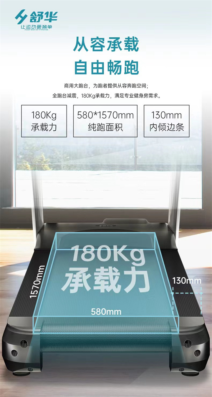 智能商用跑步机SH-T8919T-Y50(V9+)全跑台减震设计,跑台尺寸达580×1570mm,马达采用3.0CP,配备21.5寸大屏,速度范围0.8—20km/h,坡度也可以-3—15%,可承受180kg的使用者使用。